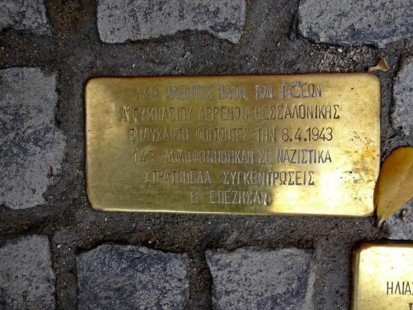 Στις 8 Απριλίου 1943, 149 Έλληνες εβραίοι μαθητές του Α’ Γυμνάσιου Αρρένων Θεσσαλονίκης «επαύσαντο φοιτούντες» του σχολείου. Οι μαθητές εκτοπίστηκαν τις επόμενες εβδομάδες μαζί με τις οικογένειες τους από τις φασιστικές δυνάμεις κατοχής σε στρατόπεδα συγκέντρωσης, οι περισσότεροι από αυτούς στο Άουσβιτς. Μόνο έξι από αυτούς επέζησαν του Ολοκαυτώματος. Πριν λίγες μέρες στην μνήμη των θυμάτων του Α’ Γυμνάσιου Αρρένων τοποθετήθηκαν μνημειακές πλακέτες στο πεζοδρόμιο μπροστά στο σχολείο, το οποίο βρίσκεται στη Βασιλίσσης Όλγας 3.