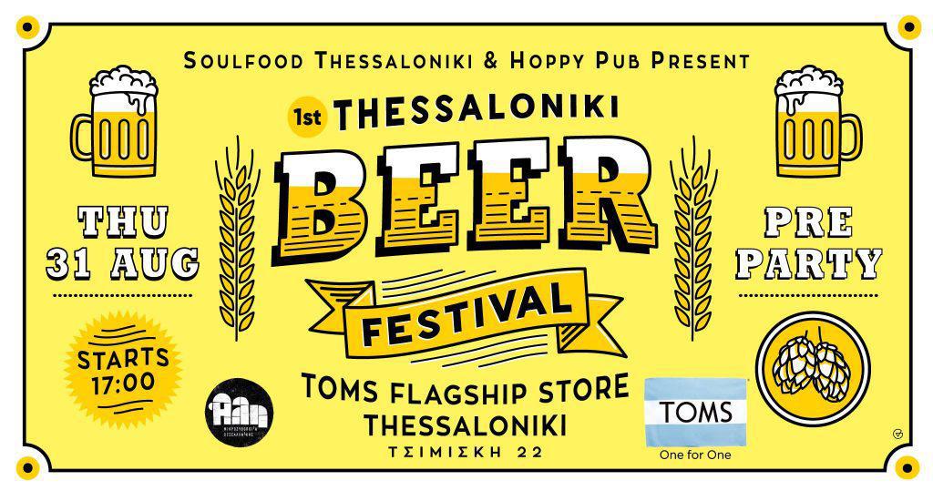 Την Πέμπτη 31 Αυγούστου η στοά του Toms Flagship γίνεται η καρδιά του 1st Thessaloniki Beer Festival και το κατάλληλο μέρος να ενημερωθείς για όλα όσα χρειάζεται να γνωρίζεις πρίν το φεστιβάλ αλλά και να απολαύσεις τις μπύρες της μικροζυθοποιίας Άλη. Μουσική από τους DJs του SoulFood, beer snacks από τον Chef Savvas Smalis, official merchandise του 1st TBF 17, beer pong και φυσικά μπύρα.