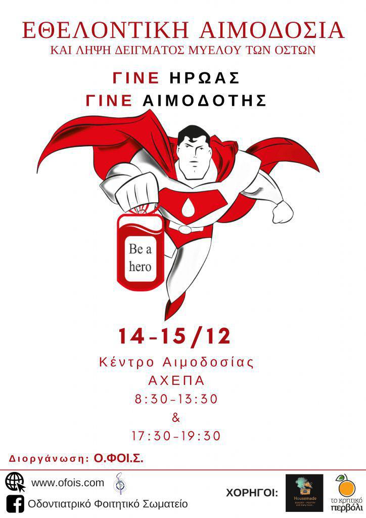 *Πέμπτη 14 και Παρασκευή 15/12 στο Κέντρο Αιμοδοσίας ΑΧΕΠΑ στις 8:30-13:30 και 17:30-19:30.