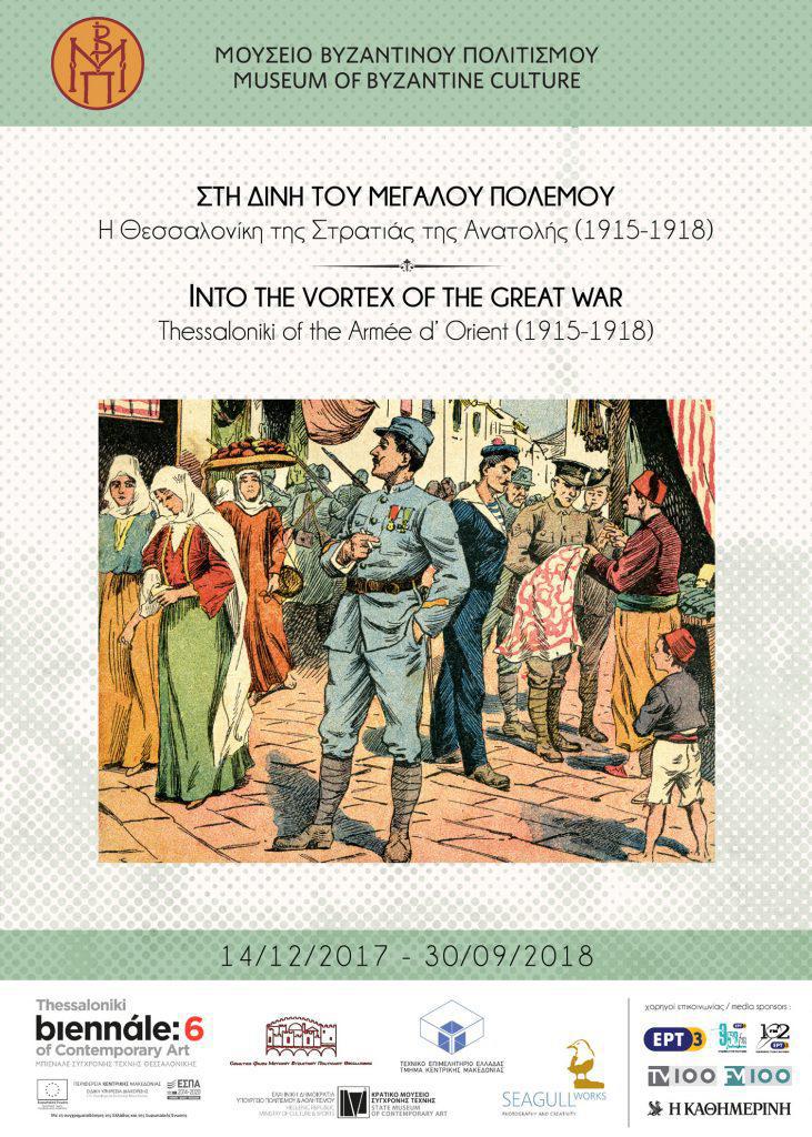 Το Μουσείο Βυζαντινού Πολιτισμού διοργανώνει την περιοδική έκθεση με τον τίτλο «Στη Δίνη του Μεγάλου Πολέμου: Η Θεσσαλονίκη της Στρατιάς της Ανατολής», στην αίθουσα πολλαπλών χρήσεων «Ευτυχία Κουρκουτίδου – Νικολαΐδου». Η έκθεση που θα διαρκέσει από τις 14 Δεκεμβρίου 2017 έως τις 30 Σεπτεμβρίου 2018 είναι μια παραγωγή του Μουσείου και εντάσσεται στο Κεντρικό Πρόγραμμα της 6ης Μπιενάλε Σύγχρονης Τέχνης Θεσσαλονίκης που διοργανώνεται από το Κρατικό Μουσείο Σύγχρονης Τέχνης και συγχρηματοδοτείται από την Ελλάδα και την Ευρωπαϊκή Ένωση (Ευρωπαϊκό Ταμείο Περιφερειακής Ανάπτυξης). Αφορμή για τη διοργάνωση της παρούσας έκθεσης αποτέλεσε η συντήρηση και φύλαξη που το Μουσείο Βυζαντινού Πολιτισμού ανέλαβε για το πρωτότυπο σχέδιο του Ερνέστ Εμπράρ της συλλογής του Τεχνικού Επιμελητηρίου Ελλάδας – Παραρτήματος Κεντρικής Μακεδονίας. Το έργο αποτυπώνει το τμήμα της πλατείας Αριστοτέλους πάνω από την Εγνατία, όπου σύμφωνα με τον σχεδιασμό που προτάθηκε μετά την πυρκαγιά προβλεπόταν να στεγαστεί το Δημαρχείο και η Διοίκηση της Πόλης. Πέρα από τη συνήθη πρακτική που αντιμετωπίζει το σχέδιο Εμπράρ μεμονωμένα ως κορυφαία στιγμή της πολεοδομίας της Θεσσαλονίκης, η παρούσα έκθεση επιχειρεί να εντάξει το έργο στο ιστορικό πλαίσιο του Α΄ Παγκοσμίου Πολέμου και της παρουσίας της Στρατιάς της Ανατολής στην πόλη, όπως αυτή μαρτυρείται μέσα από τις αναπαραστάσεις των ξένων στρατιωτών ή μη.