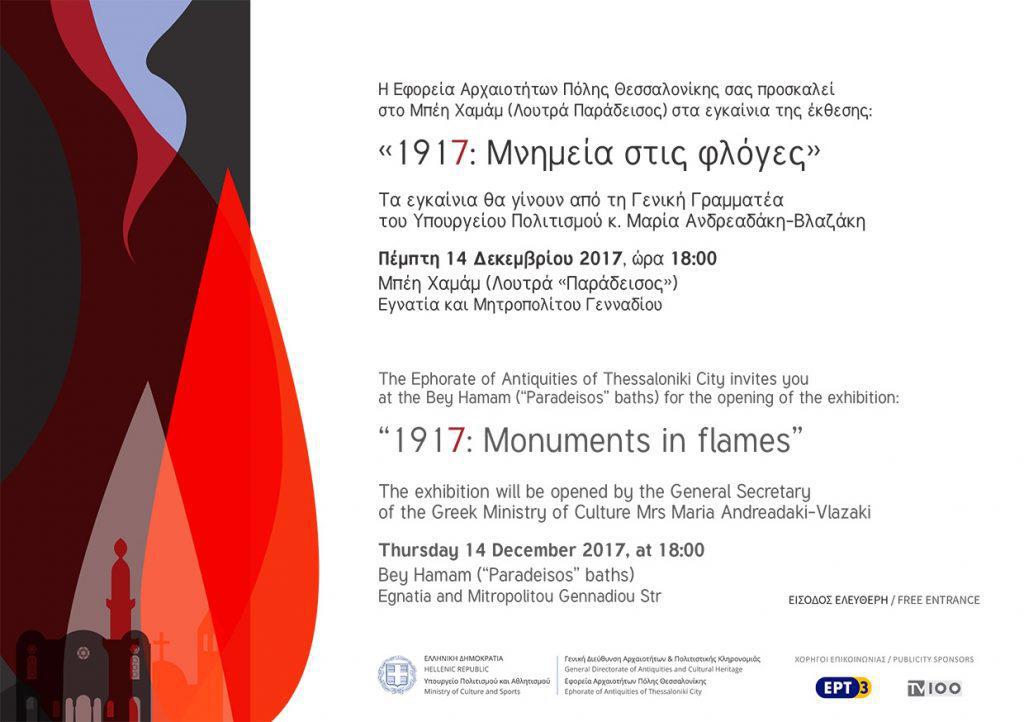 Τα εγκαίνια της έκθεσης θα γίνουν από την Γενική Γραμματέα του Υπουργείου Πολιτισμού κ. Μαρία Ανδρεαδάκη-Βλαζάκη. Το 1917 η Θεσσαλονίκη μετρούσε μόλις πέντε χρόνια στο ελληνικό κράτος. Η πόλη ισορροπούσε ανάμεσα στον πολυπολιτισμικό της χαρακτήρα και τη νέα ελληνική διοίκηση σε ένα περιβάλλον ρευστότητας που εντεινόταν από την εμπλοκή στο Μεγάλο Πόλεμο. Με τη φωτιά του Αυγούστου του 1917 σφραγίστηκε ένα άγνωστο για μας παρελθόν, δημιουργήθηκε, όμως, μια νέα πόλη. Πολλές από τις καθημερινές φωνές της πόλης του 1917 έχουν σωπάσει. Μουσουλμάνοι και Εβραίοι, με την ανταλλαγή των πληθυσμών το 1923 και το Ολοκαύτωμα το 1943, πλήρωσαν το βαρύτερο τίμημα στη μνήμη. Νησίδες μνήμης, σημεία αναφοράς και ιστορικές σταθερές, σε κάθε εποχή, σε κάθε αλλαγή, καταστροφή και ανασύνταξη της πόλης, ήταν και θα είναι τα μνημεία της. Ζωντανεύουν από τους ανθρώπους, αυτούς που έφυγαν και αυτούς που έρχονται, και διατηρούν ενεργή τη μνήμη στην πόλη.