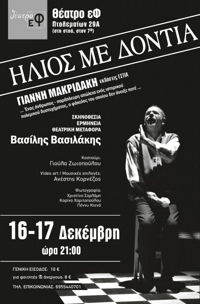 *Σάββατο 16 και Κυριακή 17/12 στις 21:00 στο θέατρο εΦ, Πτολεμαίων 29Α (στη στοά, στον 7ο), Είσοδος: €10,00 // Για φοιτητές & ανέργους: €8,00, τηλέφωνο επικοινωνίας-κρατήσεων: 6955440701.