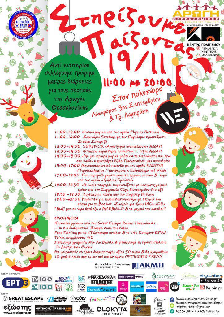 Τo 7o ”Στηρίζουμε…Παίζοντας” έρχεται την Κυριακή 19/11/2017 από τις 11.00 έως τις 20.00 στον πολυχώρο WE (Λεωφόρο 3ης Σεπτέμβρη & Γρ.Λαμπράκη Θεσσαλονίκη) πιο παιχνιδιάρικο από ποτέ! Ο σκοπός της εκδήλωσης είναι η συλλογή τροφίμων για τις άπορες οικογένειες που στηρίζει η ΑΡΩΓΗ ΘΕΣΣΑΛΟΝΙΚΗΣ και πραγματοποιείται στο πλαίσιο των δραστηριοτήτων της ομάδας, με στόχο τόσο την ευαισθητοποίηση του κοινού όσο και την έμπρακτη συμμετοχή του σε θέματα εθελοντισμού και αλληλεγγύης. Για τον λόγο αυτόν, αντί εισιτηρίου, συλλέγουμε τρόφιμα μακράς διάρκειας, χαρτικά, απορρυπαντικά και είδη προσωπικής υγιεινής.