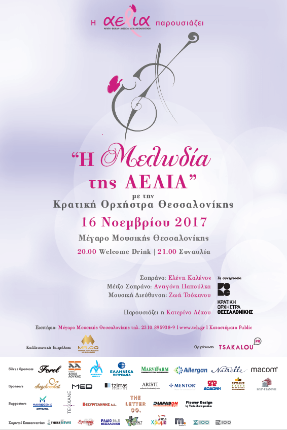 Η ΑΕΛΙΑ, στα πλαίσια ενημέρωσης και ευαισθητοποίησης του κοινού για τον καρκίνο του μαστού διοργανώνει την Συναυλία «Η ΜΕΛΩΔΙΑ ΤΗΣ ΑΕΛΙΑ» σε συνεργασία με την Κρατική Ορχήστρα Θεσσαλονίκης, στο Μέγαρο Μουσικής Θεσσαλονίκης την Πέμπτη 16 Νοεμβρίου 2017. Συμμετέχουν οι διεθνώς καταξιωμένες Ελληνίδες λυρικές τραγουδίστριες Ελένη Καλένος, σοπράνο και Αντιγόνη Παπούλκα, μέτζο σοπράνο με αγαπημένες άριες και ντουέτα από το λυρικό ρεπερτόριο, υπό την μουσική διεύθυνση της Ζωής Τσόκανου. Παρουσιάστρια της βραδιάς θα είναι η ηθοποιός Κατερίνα Λέχου. Για το θέμα αυτό η ΑΕΛΙΑ και η ΚΡΑΤΙΚΗ ΟΡΧΗΣΤΡΑ ΘΕΣΣΑΛΟΝΙΚΗΣ διοργανώνουν συνέντευξη τύπου την Τρίτη 14 Νοεμβρίου, ώρα 14:00 στην Αίθουσα Συναυλιών Κ.Ο.Θ. ‘Σόλων Μιχαηλίδης’, Λ. Νίκης 73.
