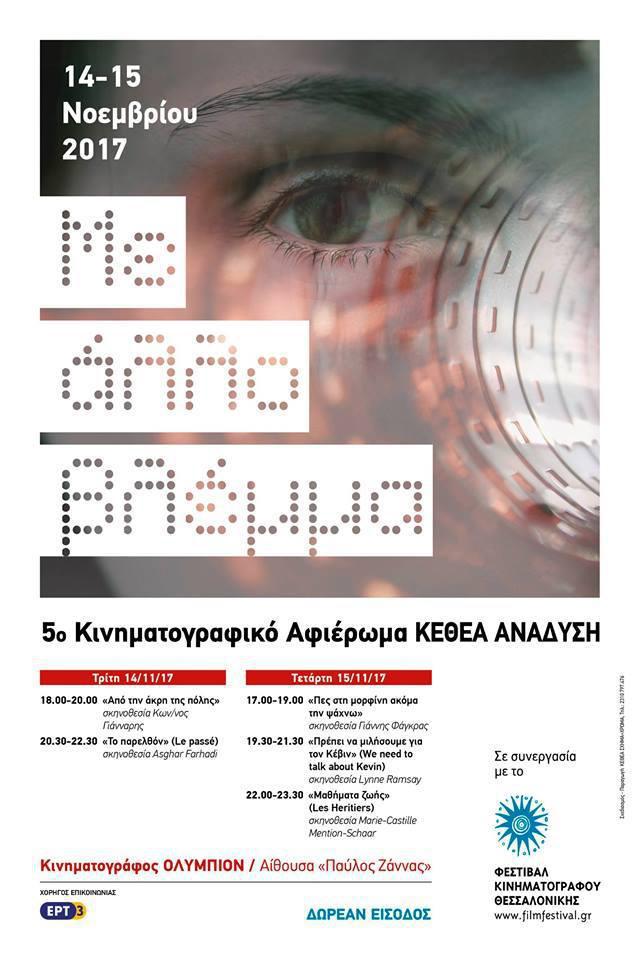Το ΚΕΘΕΑ ΑΝΑΔΥΣΗ , με την υποστήριξη του Φεστιβάλ Κινηματογράφου Θεσσαλονίκης, διοργανώνει διήμερο φεστιβάλ προβολής ταινιών με τίτλο «Άλλο βλέμμα» στις 14 με 15 Νοεμβρίου 2017 στον κινηματογράφο Ολύμπιον, στην αίθουσα «Παύλος Ζάννας» στη Θεσσαλονίκη.