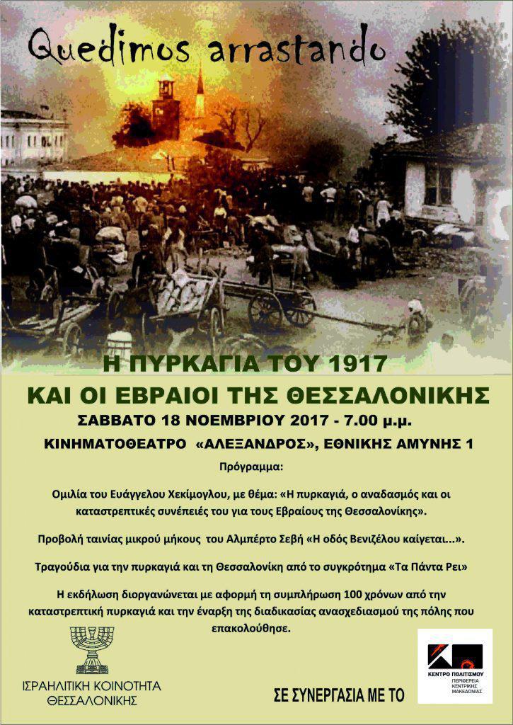 Το Κέντρο Πολιτισμού της Περιφέρειας Κεντρικής Μακεδονίας σε συνεργασία με την Ισραηλίτικη Κοινότητα Θεσσαλονίκης διοργανώνουν την εκδήλωση: “Quedimos arrastando: Μείναμε ξεσπιτωμένοι, η πυρκαγιά του 1917 και οι εβραίοι της Θεσσαλονίκης”, το Σάββατο 18 Νοεμβρίου 2017 και ώρα 19:00, στο Πολιτιστικό Κέντρο «Αλέξανδρος», (Εθνικής Αμύνης 1).