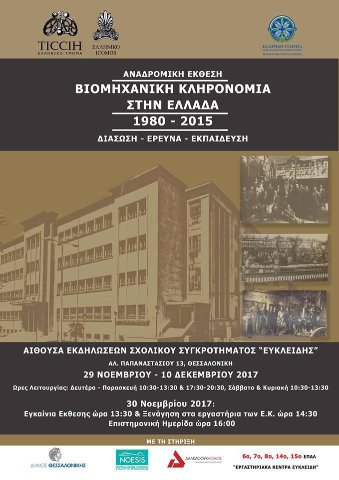 Η έκθεση «Βιομηχανική Κληρονομιά στην Ελλάδα 1980-2015, Διάσωση-Έρευνα – Εκπαίδευση» επιχειρεί μια αναδρομή στη δυναμική πορεία ανακάλυψης, τεκμηρίωσης, διάσωσης, επανάχρησης και αναβίωσης των νεότερων καταλοίπων του τεχνικού μας πολιτισμού. Αναζητά κορυφαίες εκφάνσεις και αξιόλογες προσπάθειες -έστω και αν έμειναν μετέωρες- αυτής της πορείας στις απαρχές του ρεύματος για την προστασία της βιομηχανικής κληρονομιάς στην επικοινωνία με τις αντίστοιχες διεθνείς πρωτοβουλίες, στις μεγάλες έρευνες και καταγραφές της προβιομηχανικής και βιομηχανικής δραστηριότητας, στη συστηματική τεκμηρίωση των πόλεων της γέννησης της βιομηχανίας, αλλά και της αποβιομηχάνισης. Παρουσιάζει ακόμη το σημαντικό έργο το οποίο έχει αναπτυχθεί σε όλες τις βαθμίδες της εκπαίδευσης, στα μουσεία, στα αρχεία, ενώ παράλληλα εστιάζει στις προσπάθειες για τη διάσωση και αναβίωση ιστορικών μηχανών και τεχνικών, καθώς και της εργασίας.