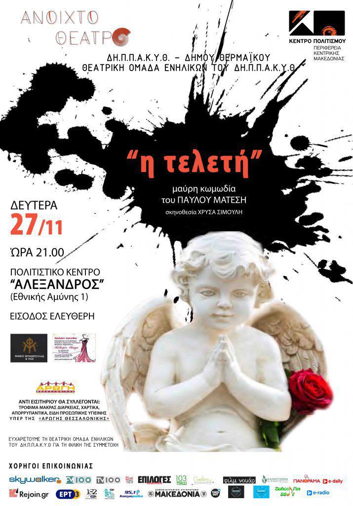 *Σάββατο 2/12 και Κυριακή 3/12 στις 20:00 στο Πολιτιστικό Κέντρο Αλέξανδρος, Εθνικής Αμύνης 1, Αντί εισιτηρίου θα συλλέγονται: τρόφιμα μακράς διαρκείας, χαρτικά – απορρυπαντικά – είδη προσωπικής υγιεινής υπέρ της «ΑΡΩΓΗΣ ΘΕΣΣΑΛΟΝΙΚΗΣ»