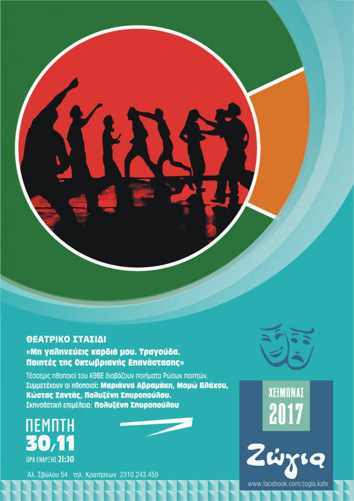 Τέσσερις ηθοποιοί από το Κρατικό Θέατρο Βορείου Ελλάδος διαβάζουν ποιήματα Ρώσων ποιητών, στο καφέ Ζώγια την Πέμπτη 30 Νοεμβρίου 2017, στις 21.30. Η δράση «Μη γαληνεύεις, καρδιά μου. Τραγούδα: Ποιητές της Οκτωβριανής Επανάστασης» πραγματοποιείται για δεύτερη φορά, μετά την επιτυχή της παρουσίαση στη διημερίδα «100 χρόνια από την Οκτωβριανή επανάσταση: Ουτοπία και ματαίωση, πρωτοπορίες και κοινωνική αλλαγή» που διοργανώθηκε τον Οκτώβριο από το Μέγαρο Μουσικής Θεσσαλονίκης. Ο Οκτώβρης του 1917 συγκαταλέγεται αναμφίβολα στα γεγονότα σταθμούς του 20ού αιώνα, καθώς έθεσε σε κίνηση μια μακρόχρονη όσο και πολύσημη ιστορική δυναμική. Η ερμηνεία του, έναν αιώνα αργότερα, παραμένει ανοιχτή τόσο στον επιστημονικό όσο και στον δημόσιο λόγο.