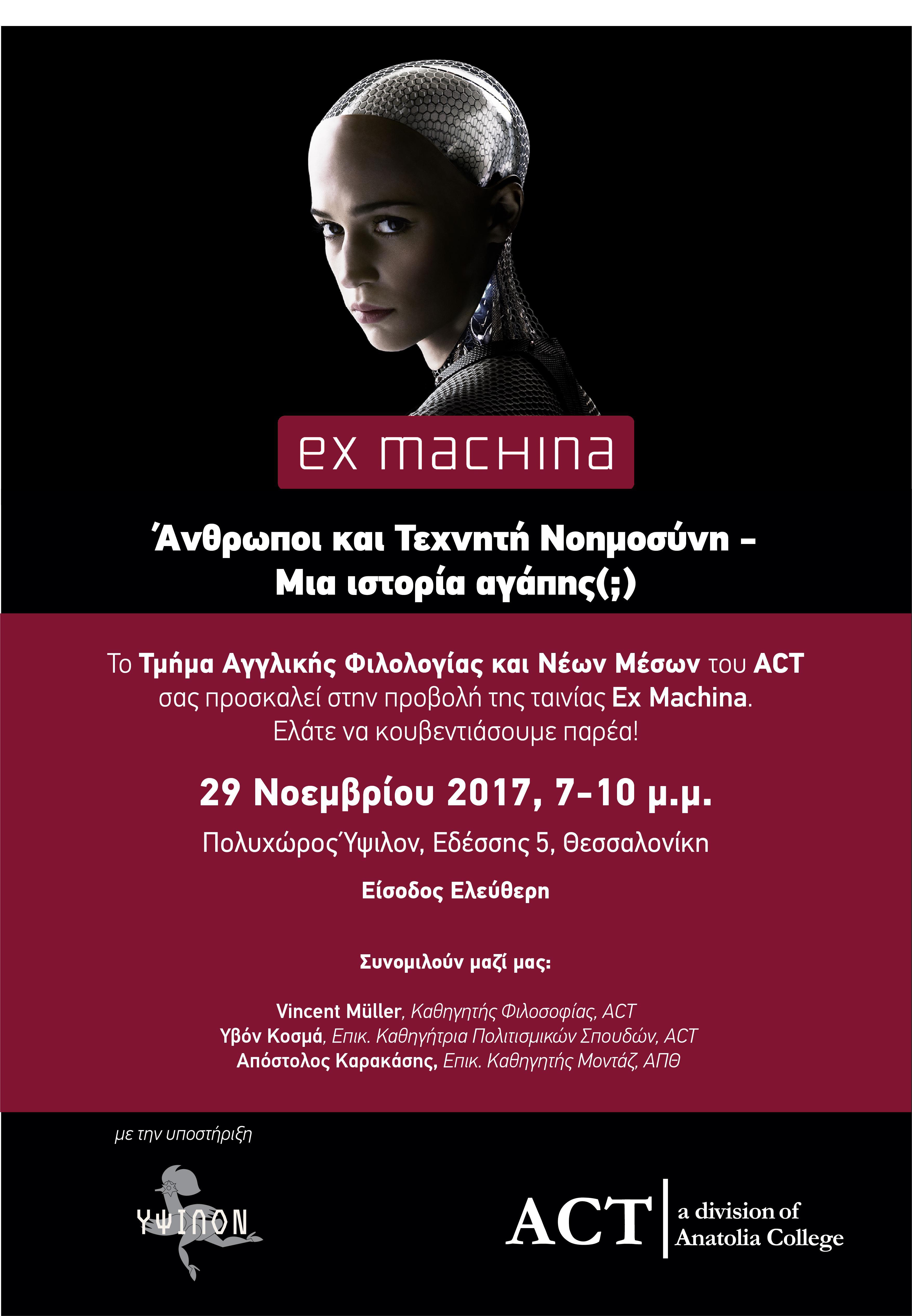 Το Τμήμα Αγγλικής Γλώσσας και Νέων Μέσων του ACT σας προσκαλεί στην προβολή της ταινίας Ex Machina.Μετά θα πιούμε το ποτό μας και θα κουβεντιάσουμε για την ταινία με τον Vincent Müller (καθηγητής φιλοσοφίας, ACT), την Υβόν Κοσμά (επικ. καθηγήτρια Κοινωνιολογίας, ACT) και τον Απόστολο Καρακάση (επικ. καθηγητής μοντάζ, ΑΠΘ).