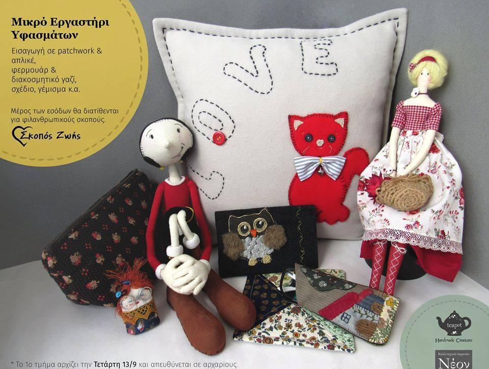 Ένα εργαστήρι εκμάθησης ραπτικής με το χέρι και δημιουργίας χρηστικών αντικειμένων από ύφασμα, για αρχάριους. Σκοπός του εργαστηρίου είναι η εκμάθηση δημιουργίας χρηστικών αντικειμένων από ύφασμα, η γνώση διαφόρων τεχνικών διακόσμησης του υφάσματος & tips ραπτικής και η μέθοδος κατασκευής πάνινης κούκλας. Η διάρκεια κάθε τμήματος είναι μηνιαία και αποτελείται από τέσσερα (4) μαθήματα τριών (3) ωρών με μία (1) συνάντηση την εβδομάδα. Το κόστος μαθημάτων είναι 60 € και συμπεριλαμβάνονται όλα τα υλικά των κατασκευών. Μέρος των εσόδων θα διατεθεί για τη στήριξη συνανθρώπων μας που χρήζουν βοήθειας, ο οποίοι θα προταθούν από τους συμμετέχοντες ( θα ανακοινωθούν προσεχώς).