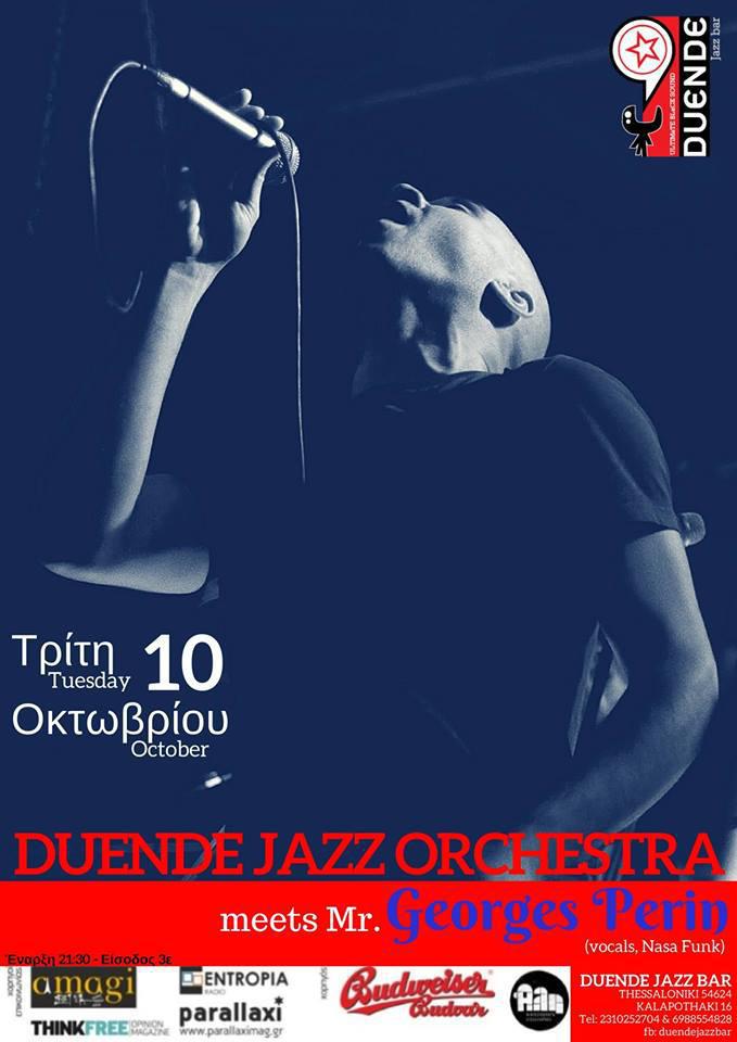 Η Duende Jazz Orchestra βουτάει σε πιο βαθιά soul funk νερά για να συνοδεύσει τον Georges Perin, τη γνώριμη φωνή των Nasa Funk. Το αποτέλεσμα της ένωσης των δύο κόσμων (jazz quartet – soul funk vocals) μπορείτε να το μάθετε λίγο μετά τις 21:30, στο γνωστό ραντεβού της Τρίτης.