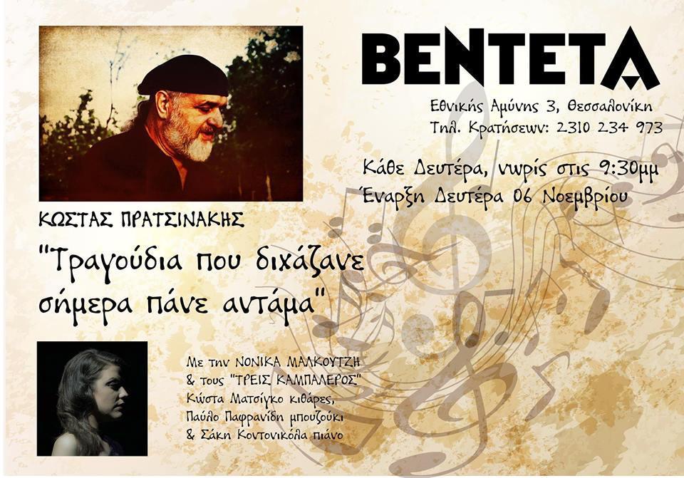 “Τραγούδια που διχάζανε, σήμερα πάνε αντάμα” μια ξεχωριστή μουσική παράσταση για τις Δευτέρες της Θεσσαλονίκης στη “ΒΕΝΤΕΤΑ” ετοίμασε ο Κώστας Πρατσινάκης. Θα έχει μαζί του τη Νόνικα Μαλκουτζή & τους Τρεις καμπαλέρος (Κώστα Ματσίγκο κιθάρες-Σάκη Κοντονικόλα πιάνο-& Παύλο Παφρανίδη μπουζούκι.