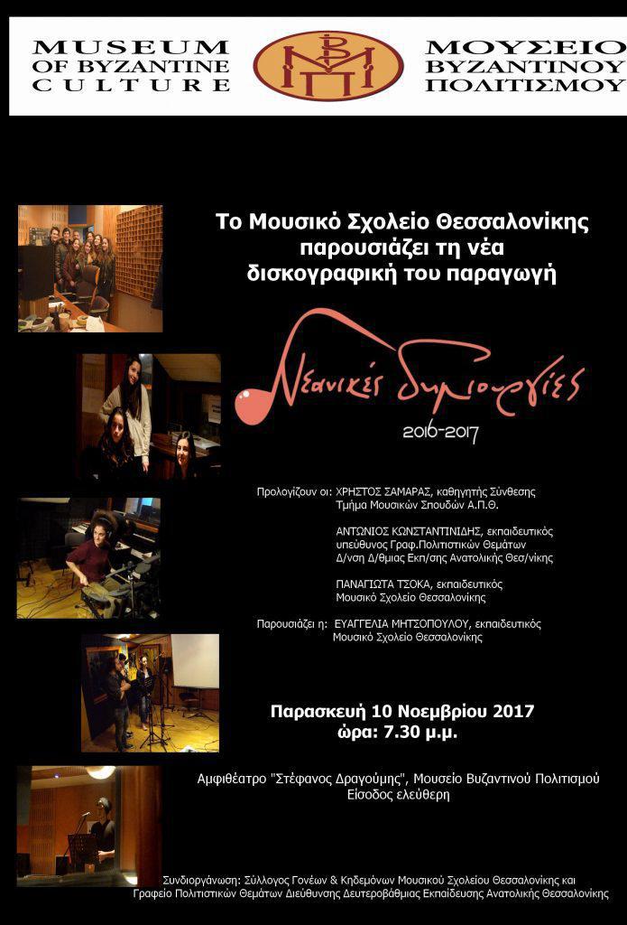 Μαθητές και μαθήτριες του Μουσικού Σχολείου Θεσσαλονίκης θα παρουσιάσουν και θα ερμηνεύσουν πρωτότυπες βραβευμένες συνθέσεις τους οι οποίες οδήγησαν στην ηχογράφηση CD, με τίτλο Νεανικές Δημιουργίες 2016-2017. Η εκδήλωση γίνεται σε συνδιοργάνωση του Μουσείου Βυζαντινού Πολιτισμού με το Γραφείο Πολιτιστικών Θεμάτων της Διεύθυνσης Δευτεροβάθμιας Εκπαίδευσης Ανατολικής Θεσσαλονίκης και το Σύλλογο Γονέων και Κηδεμόνων του Μουσικού Σχολείου Θεσσαλονίκης. Η νέα δισκογραφική παραγωγή του Μουσικού Σχολείου Θεσσαλονίκης είναι αποτέλεσμα πολιτιστικού προγράμματος που πραγματοποίησαν μαθητές της Α και Β Λυκείου του Μουσικού Σχολείου Θεσσαλονίκης με υπεύθυνη καθηγήτρια την Ευαγγελία Μητσοπούλου. Μαθητές και μαθήτριες το σχολικό έτος 2016-17 συνέθεσαν και ερμήνευσαν δικά τους κομμάτια, τα οποία βραβεύθηκαν σε μαθητικούς διαγωνισμούς. Οι ηχογραφήσεις έγιναν τον Φεβρουάριο, τον Απρίλιο και τον Ιούνιο 2017 στο στούντιο του Πανεπιστημίου Μακεδονίας. Την ηχοληψία, την επεξεργασία, το mastering του CD έκανε ο Φώτης Σακαλής και τη σχεδίαση του εντύπου ο γραφίστας Χρήστος Διττόπουλος. Οι φωτογραφίες είναι στιγμιότυπα από τις ηχογραφήσεις στο στούντιο της οποίες αποτύπωσε με τον φωτογραφικό της φακό η μαθήτρια της Α’ Λυκείου Μ.Σ.Θ. Ευγενία Σκολίδη.