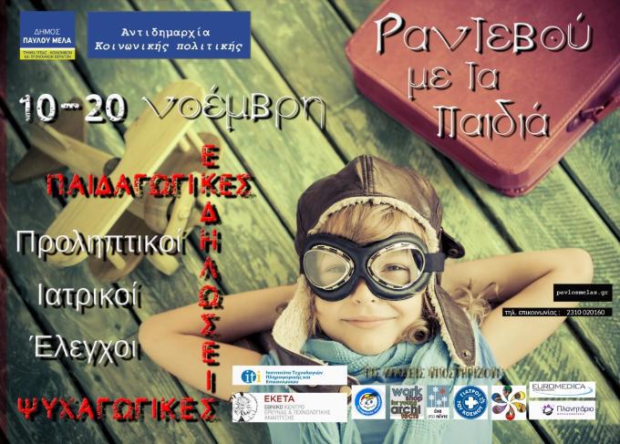 Η Αντιδήμαρχος Κοινωνικής Πολιτικής, Υγείας & Προνοιακών Θεμάτων του Δήμου Παύλου Μελά Χαρά Αμανατίδου καλεί τους γονείς – κηδεμόνες να κλείσουν ραντεβού για προληπτικές εξετάσεις στο πλαίσιο της σειράς εκδηλώσεων ΡΑΝΤΕΒΟΥ ΜΕ ΤΑ ΠΑΙΔΙΑ που στόχος τους είναι η πρόληψη και ενημέρωση της τοπικής κοινωνίας σε θέματα υγείας της παιδικής ηλικίας. Παράλληλα το ΤΜΗΜΑ ΚΟΙΝΩΝΙΚΗΣ ΠΟΛΙΤΙΚΗΣ, ΥΓΕΙΑΣ ΚΑΙ ΠΡΟΝΟΙΑΚΩΝ ΘΕΜΑΤΩΝ εξασφάλισε και μια σειρά από εξαιρετικές δράσεις οι οποίες συνδυάζουν τη ψυχαγωγία των παιδιών και την ταυτόχρονη ευαισθητοποίηση και εκπαίδευσή τους σε θέματα που άπτονται της ηλικίας τους.