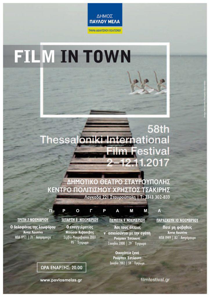 Διευρύνεται η καλλιτεχνική συνεργασία Φεστιβάλ Κινηματογράφου Θεσσαλονίκης και Δήμου Παύλου Μελά, που ξεκίνησε το Σεπτέμβρη 2016 στο πρώην στρατόπεδο Παύλου Μελά, με την ανοιχτή προβολή της ανατρεπτικής κωμωδίας Φρανκενστάιν Τζούνιορ του Μελ Μπρουκς και συνεχίστηκε το φετινό Μάρτιο με το 19ο Φεστιβάλ Ντοκιμαντέρ Θεσσαλονίκης και τις Ειδικές προβολές Ντοκιμαντέρ DOC IN TOWN στο Δημοτικό Θέατρο του Κέντρου Πολιτισμού Χρήστος Τσακίρης. Η Διοίκηση του παγκόσμιου κινηματογραφικού θεσμού δια στόματος του Καλλιτεχνικού Διευθυντή Ορέστη Ανδρεαδάκη, ανακοίνωσε τη Δευτέρα 23 Οκτωβρίου, στη συνέντευξη τύπου – παρουσίαση της φετινής διοργάνωσης, ότι στο πλαίσιο του 58ου Φεστιβάλ Κινηματογράφου Θεσσαλονίκης και των FILM IN TOWN, θα προβληθούν 5 συνολικά ταινίες δυτικά της πόλης, στο Θέατρο του Κέντρου Πολιτισμού ΧΡΗΣΤΟΣ ΤΣΑΚΙΡΗΣ, με ελεύθερη είσοδο.