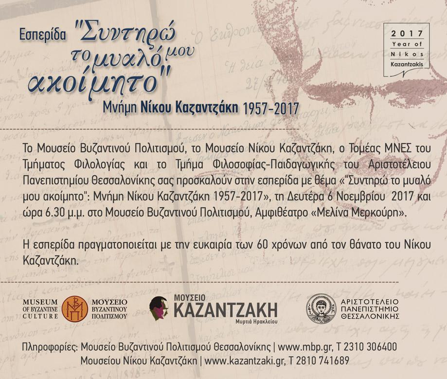 Το Μουσείο Βυζαντινού Πολιτισμού, το Μουσείο Νίκου Καζαντζάκη, ο Τομέας Μεσαιωνικών και Νέων Ελληνικών Σπουδών του Τμήματος Φιλολογίας και το Τμήμα Φιλοσοφικής-Παιδαγωγικής του Αριστοτελείου Πανεπιστημίου Θεσσαλονίκης σας προσκαλούν στην εσπερίδα με θέμα “Συντηρώ το μυαλό μου ακοίμητο”: μνήμη Νίκου Καζαντζάκη 1957-2017, τη Δευτέρα 6 Νοεμβρίου στις 6.30 μ.μ. στο Μουσείο Βυζαντινού Πολιτισμού στο αμφιθέατρο “Μελίνα Μερκούρη”. Η εσπερίδα πραγματοποιείται με την ευκαιρία των 60 χρόνων από το θάνατο του Νίκου Καζαντζάκη.