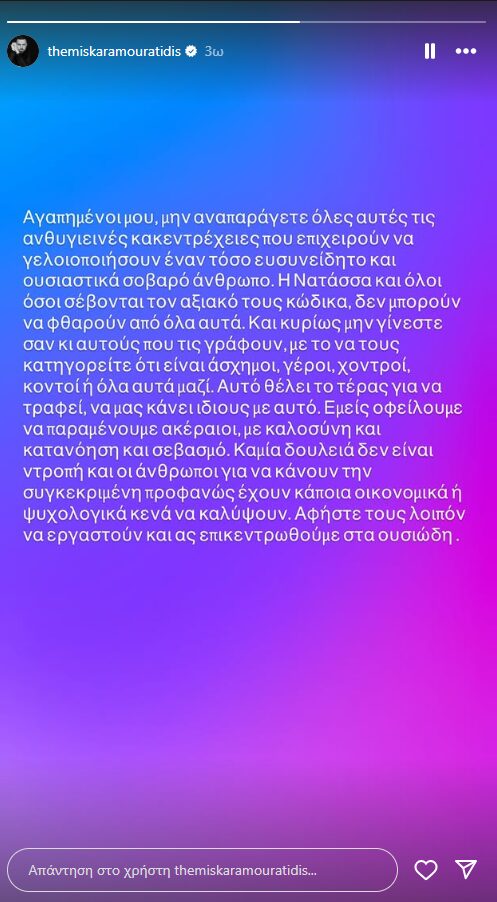 Συγκεκριμένα, ο δημοσιογράφος πόσταρε στον λογαριασμό του στο Twitter ένα άρθρο με τίτλο “Η Νατάσσα Μποφίλιου δημοσίευσε στιγμιότυπό της με μπικίνι από την Φολέγανδρο” και σχολίασε: “Πρώτη θέση σε διαγωνισμό κρατήματος αναπνοής”.