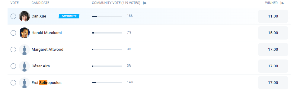 Εξίσου ψηλά, αν και κατά τι χαμηλότερα από τη λίστα Ladbrokes, η Έρση Σωτηροπούλου εμφανίζεται στη λίστα της στοιχηματικής Oddspedia. Και αυτή η εταιρεία, εκτός από τα στοιχήματα για κάθε πιθανό άθλημα, δίνει προβλέψεις και για το βραβείο Νόμπελ Λογοτεχνίας. Αυτή τη στιγμή, η Ελληνίδα συγγραφέας βρίσκεται 5η στη σειρά, με απόδοση 17:1.