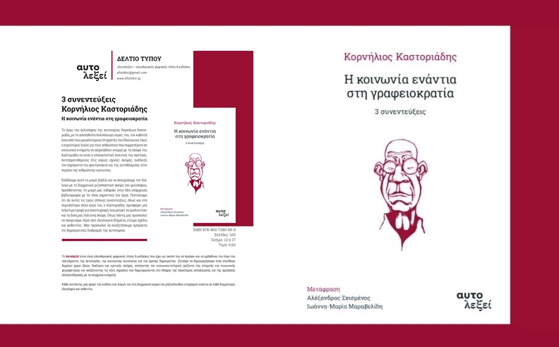 Ένα κείμενο του Ηλία Καραβόλια για το νέο βιβλίο που κυκλοφόρησε στο τέλος του ’21 από τις εκδόσεις Αυτολεξεί, Κορνήλιος Καστοριάδης. Η κοινωνία ενάντια στη γραφειοκρατία – 3 συνεντεύξεις, Αθήνα: Αυτολεξεί, Δεκέμβριος 2021, σελ. 120, διαστάσεις 17×12, ISBN 978-960-7280-58-9