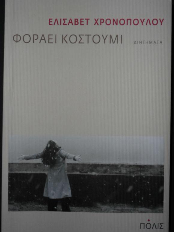 Η Ελισάβετ Χρονοπούλου, γνωστή στους περισσότερους ως σκηνοθέτις, κερδίζει τον αναγνώστη με μια συλλογή οκτώ διηγημάτων, γραμμένη με ένταση αλλά και ωριμότητα κι ας πρόκειται για το συγγραφικό της ντεμπούτο. Αυτό που κάνει τη συλλογή να ξεχωρίζει είναι οι καλά σχηματισμένοι χαρακτήρες αλλά και η δομή των διηγημάτων των, α οποία ξεκινούν ως καθημερινές, σχεδόν συνηθισμένες ιστορίες για να πάρουν όμως μια αναπάντεχη τροπή. Το αρτιότερο ίσως διήγημα είναι το ομώνυμο «φοράει κοστούμι», με την εξαιρετική και πρωτότυπη διαχείριση ενός θέματος που συναντάμε συχνά, όπως είναι η γυναικεία κακοποίηση. Η πρωτοτυπία στη σύλληψη και όχι μόνο της συγκεκριμένης ιστορίας, κάνει τον αναγνώστη του βιβλίου να περιμένει με ενδιαφέρον και το επόμενο της συγγραφέα. (εκδ. Πόλις).