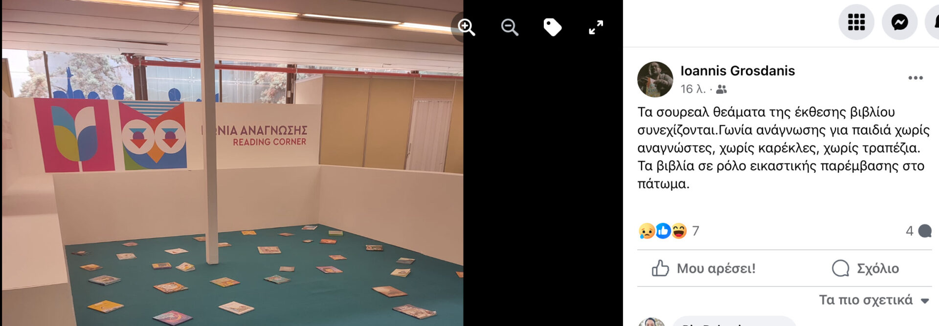 Με έκπληξη ανακάλυψαν οι εκδότες, όπως κατήγγειλαν στην parallaxi την προηγούμενη εβδομάδα κατά το στήσιμο της έκθεσης ότι το περίπτερο 12 ήταν εντελώς ακατάλληλο και απομονωμένο για να φιλοξενήσει αυτό το ζωντανό κομμάτι που επρόκειτο να επισκεφθούν χιλιάδες παιδιά σχολείων σε οργανωμένες επισκέψεις ή ιδιωτικά.