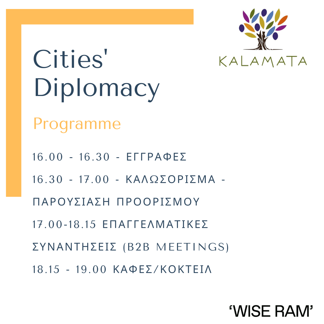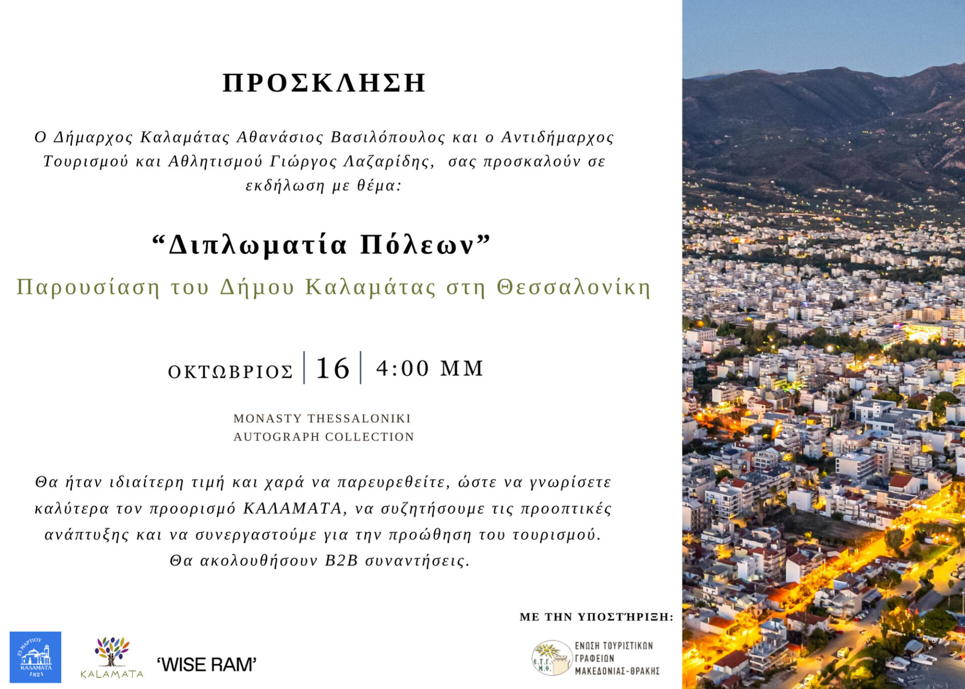 Ο Δήμαρχος Καλαμάτας, Αθανάσιος Βασιλόπουλος και ο Αντιδήμαρχος Τουρισμού και Αθλητισμού, Γιώργος Λαζαρίδης, σας προσκαλούν σε εκδήλωση με θέμα: “Διπλωματία Πόλεων”.
