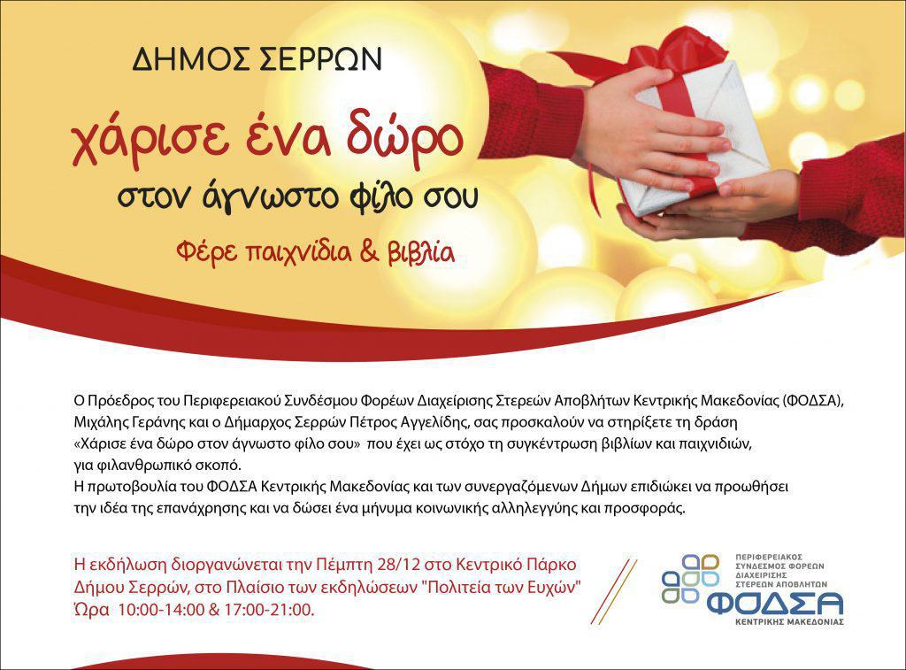 Εκστρατεία με θέμα «Χάρισε ένα δώρο σε έναν άγνωστο φίλο σου» ξεκινά ο Φορέας Διαχείρισης Στερεών Αποβλήτων (ΦΟΔΣΑ) Κεντρικής Μακεδονίας σε συνεργασία με δήμους της Περιφέρειας, με στόχο τη συλλογή παιχνιδιών και βιβλίων, που θα χαριστούν από παιδιά και θα δοθούν σε ιδρύματα που φιλοξενούν παιδιά ή σε άπορες οικογένειες.