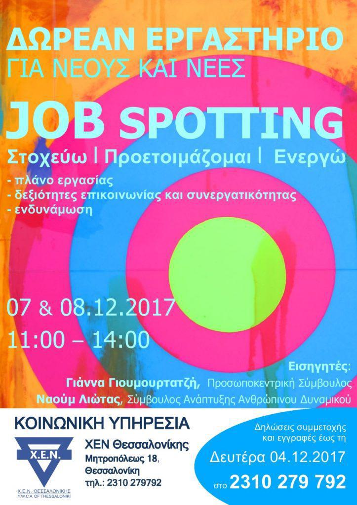 Η Κοινωνική Υπηρεσία της ΧΕΝ Θεσσαλονίκης, στο πλαίσιο της ευαισθητοποίησής της στο ζήτημα της εύρεσης εργασίας στους νέους, διοργανώνει βιωματικό εργαστήριο με τίτλο “JOB SPOTTING, Στοχεύω – Προετοιμάζομαι – Ενεργώ” με σκοπό την ανάπτυξη και καλλιέργεια δεξιοτήτων μεθοδολογίας, οργάνωσης, επικοινωνίας και στοχοθεσίας προκειμένου να προετοιμάσει τους συμμετέχοντες για την είσοδό τους στην αγορά εργασίας.