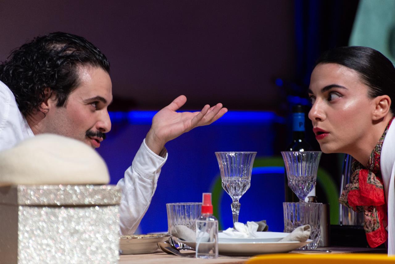 Πώς είναι να σε υποδέχονται στον πολύχρωμο χώρο του Φουαγιέ του Θεάτρου της Εταιρίας Μακεδονικών Σπουδών και να σου υποδεικνύουν να καθίσεις στις καρέκλες που είναι τοποθετημένες κυκλικά από ένα… δωμάτιο, ενώ ο ένας από τους πρωταγωνιστές είναι ήδη εκεί και ετοιμάζει ένα τραπέζι φίλων – όπως όλα δείχνουν – ενώ συχνά μιλάει και υποδέχεται ευγενικά τους «καλεσμένους» θεατές.
