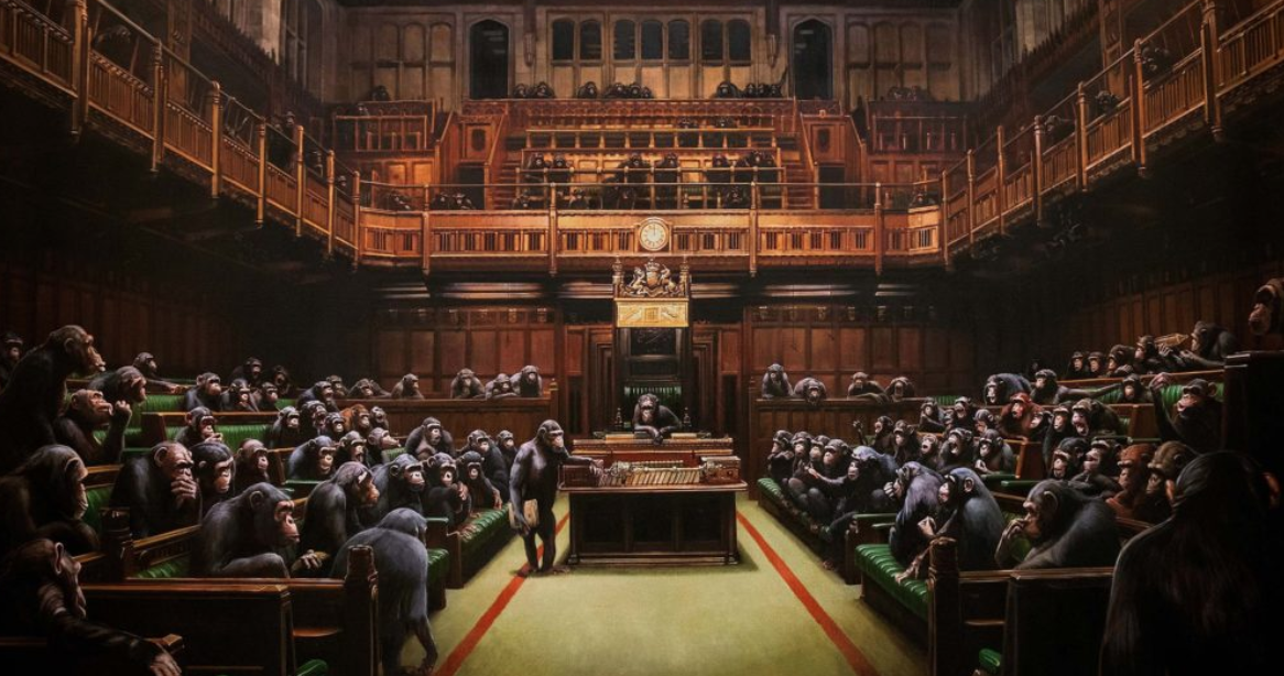 11,1 εκατ. ευρώ πουλήθηκε σε δημοπρασία στον Sotheby’s ο πίνακας του Banksy που απεικονίζει το βρετανικό κοινοβούλιο γεμάτο με χιμπατζήδες