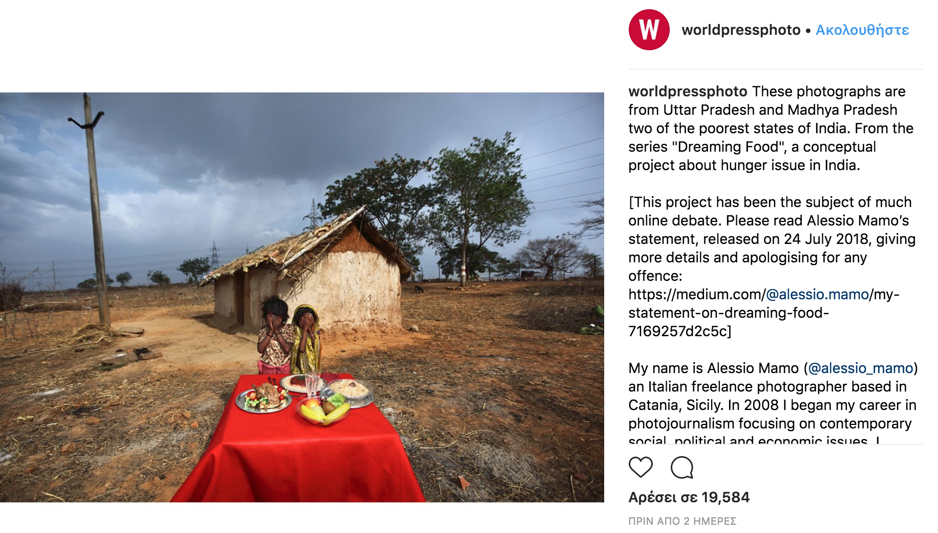 Ο Μάμο εξέδωσε σήμερα ανακοίνωση στην οποία ζητεί συγγνώμη αφού πολλοί χρήστες του Instagram και του Twitter επέκριναν αυτή τη σειρά των φωτογραφιών με τίτλο «Ονειρεύομαι φαγητό», με πολλούς να χρησιμοποιούν το hashtag #ΠορνογραφίαΦτώχειας.