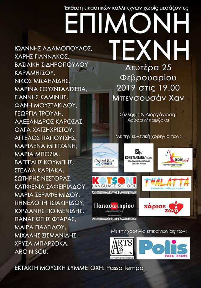 *Η ΕΠΙΜΟΝΗ ΤΕΧΝΗ 3 ήρθε τη Δευτέρα 25 Φεβρουαρίου 2019 ανανεωμένη στο Μπενσουσάν Χαν (Εδέσσης 6 στα Λαδάδικα).