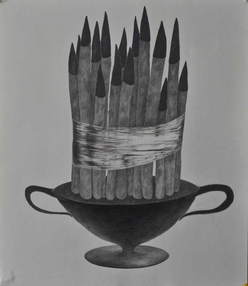 «Ένα μέρος της δουλειάς που θα παρουσιαστεί στην έκθεση είναι νέο και ένα μέρος είναι των τελευταίων 5 χρόνων. Μια βιογραφία της που διάβασα πρόσφατα φώτισε κι άλλα παράθυρα στην ‘κρυφή’ ζωή της Ντίκινσον, είναι το βιβλίο “Έμιλυ η θεά του ηφαιστείου” της Δέσποινας Λάλα-Κριστ και η οποία είναι ετεροχρονισμένη “γειτόνισσά” της. Τα πρώτα έργα πάνω σ’ αυτό το θέμα, ήταν φορτίο που είχα μέσα μου χρόνια, καθώς διάβαζα κατά καιρούς ποιήματα, σημειώσεις, αλληλογραφία της. Ήταν η Γκέλυ Γρυντάκη αυτή που άνοιξε τους “ασκούς”, όταν μου πρότεινε να συνεργαστούμε πάνω στο θέμα Έμιλυ! Είχα μεγάλη φόρα και τα έργα έβγαιναν σαν να ήταν έτοιμα συναρμολογημένα στο κεφάλι μου κι εγώ απλά ο εκτελεστής. Ως τότε δεν ήξερα αν είναι ποιητά. Στα πιο τωρινά έργα είχα κάποια αμηχανία, γιατί πλησίαζα πιο συνειδητά σ’ αυτό το μυστήριο Έμιλυ και μένω άναυδη από τα χιλιάδες πέπλα. Δε νομίζω ότι έχω φτάσει στο ξέφωτο πάντως.»
