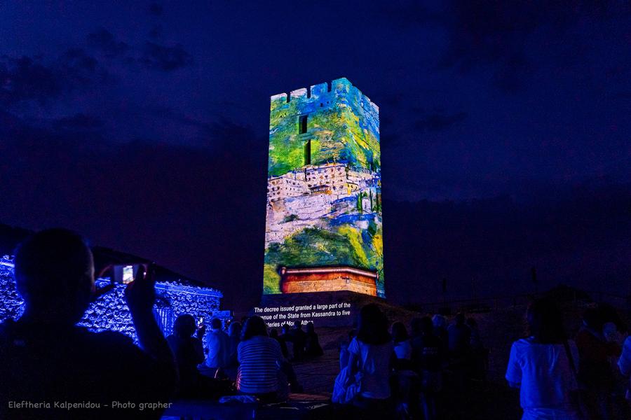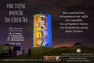 Η Εφορεία Αρχαιοτήτων Χαλκιδικής και Αγίου Όρους σε συνεργασία με τον Δήμο Κασσάνδρας, προβάλλει στις όψεις του Βυζαντινού Πύργου στη Νέα Φώκαια Χαλκιδικής ένα τρισδιάστατο ντοκιμαντέρ με τίτλο «Ένας πύργος αφηγείται την ιστορία του». Η προβολή λειτουργεί ως ένα τρισδιάστατο ντοκιμαντέρ, που αφηγείται την ιστορία του τόπου και του Βυζαντινού Πύργου στη Νέα Φώκαια μέσα στην πάροδο των αιώνων. Προκειμένου να αναπτυχθεί η εικονική σκηνογραφία της εγκατάστασης έχει μελετηθεί τόσο το επιλεγμένο κτίριο (Πύργος), όσο και ο χώρος που το περιβάλλει. Με τη βοήθεια των αποτυπώσεων των όψεων του κτιρίου, έχει σχεδιαστεί στον υπολογιστή τρισδιάστατο μοντέλο του και πάνω σε αυτό, μέσω ειδικών λογισμικών, έχει δημιουργηθεί το οπτικό περιεχόμενο. Με βάση την επιστημονική έρευνα, την προφορική παράδοση, καθώς και αρχειακό υλικό της νεώτερης ιστορίας του τόπου, έχει δημιουργηθεί ένα σενάριο, που περιγράφει οπτικοακουστικά τον τόπο και την ιστορική πορεία του μνημείου μέσα στο χρόνο. Παρουσιάζονται και αναδεικνύονται με ιδιαίτερο τρόπο οι μεταμορφώσεις του τοπίου, η πρώτη κατοίκηση, η ίδρυση μετοχίου της αθωνικής μονής Αγίου Παύλου, η χρήση του Πύργου ως στρατηγείο του Εμμ. Παππά κατά την Επανάσταση του 1821, η εγκατάσταση προσφύγων και η συντήρηση και αποκατάστασή του.