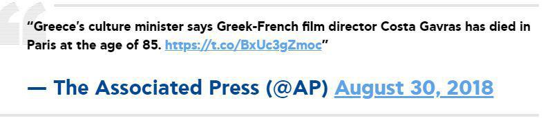 Πριν από λίγα λεπτά, αίσθηση προκάλεσε το tweet του λογαριασμού της Μυρσίνης Ζορμπά, νέας υπουργού Πολιτισμού, στο twitter, σχετικά με την είδηση του θανάτου του γνωστού σκηνοθέτη Κώστα Γαβρά: