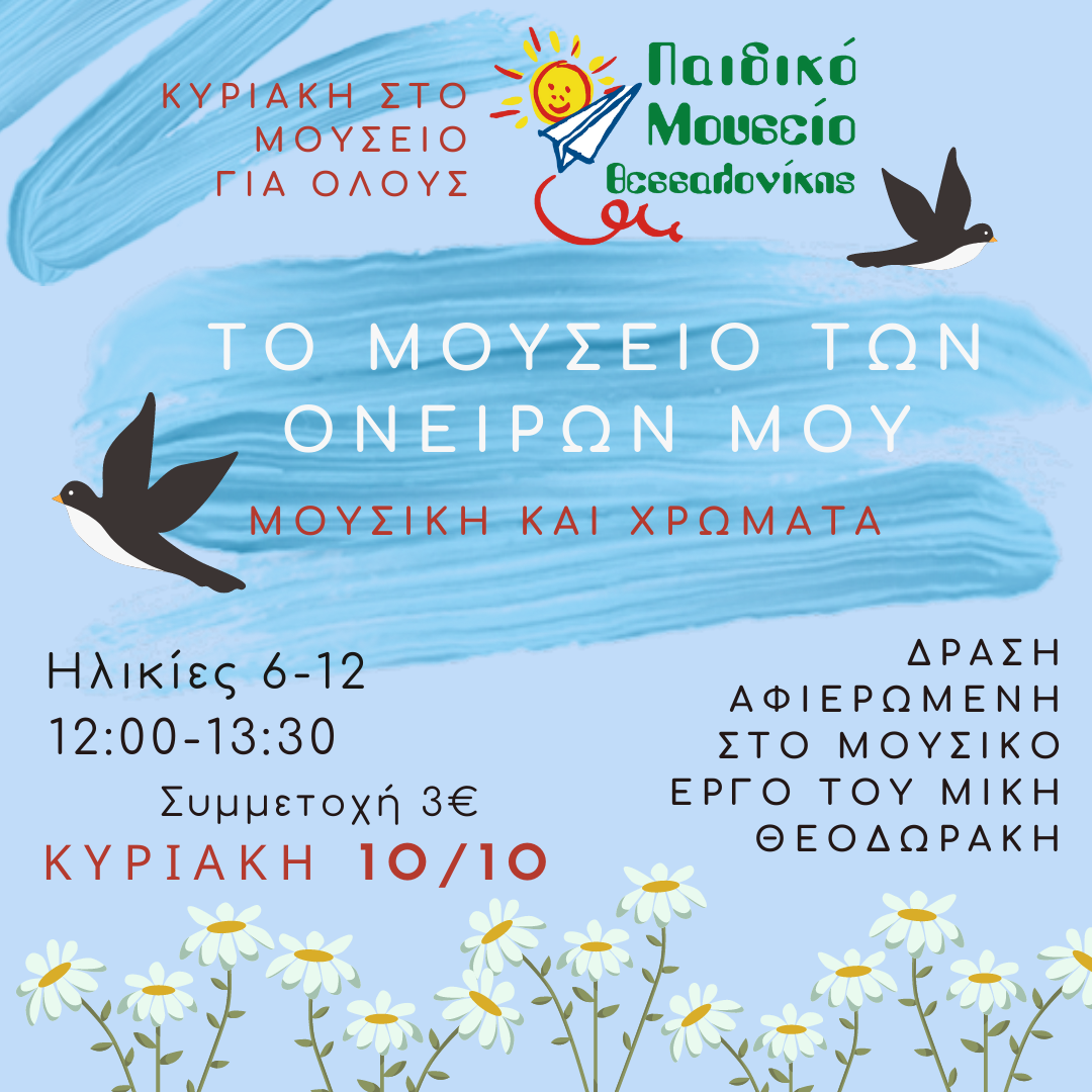 Εκπαιδευτική δράση από το Παιδικό Μουσείο Θεσσαλονίκης αφιερωμένη στο μουσικό έργο του Μ. Θεοδωράκη. Οι χαρταετοί που φεύγουν στον ουρανό, το χελιδόνι και η Μαργαρίτα η Μαργαρώ μπαίνουν φτιάχνουν γίνονται ένα μαγικό περιβάλλον δημιουργίας. Για τα μικρά παιδιά και τους γονείς τους η δράση θα συμπληρωθεί με το βιβλίο “Τι είναι αγάπη” της συγγραφέως Λίνας Σωτηροπούλου και της Ντανιέλας Σταματιάδη. Τα παιδιά 6-12 θα παίξουν μουσικοκινητικά παιχνίδια και θα δημιουργήσουν μοναδικές κατασκευές.