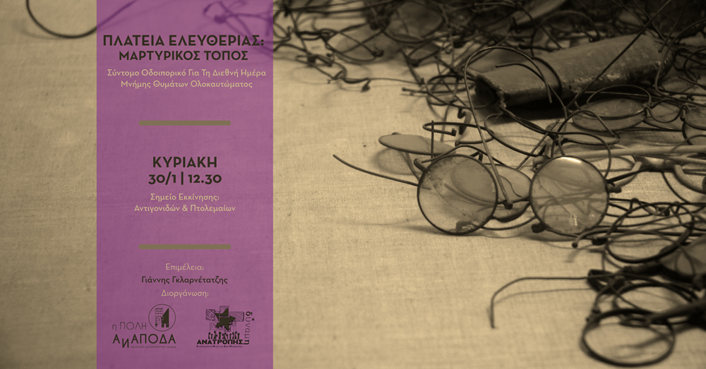 Τα δημοτικά σχήματα Η Πόλη Ανάποδα και Δύναμη Ανατροπής, στο πλαίσιο της Ημέρας Μνήμης των Θυμάτων Ολοκαυτώματος (27/1), 77 χρόνια μετά την απελευθέρωση του Άουσβιτς, σας προσκαλούν την Κυριακή 30 Ιανουαρίου 2022, στις 12:30, στη γωνία Αντιγονιδών με Πτολεμαίων, σε ένα σύντομο οδοιπορικό από τις γειτονιές των Εβραίων συμπολιτών μας στον μαρτυρικό τόπο του Μαύρου Σαββάτου (11/07/1942), την πλατεία Ελευθερίας. Μια πλατεία που, αντί να αποτελεί τόπο μνήμης όσων αποτρόπαιων συνέβησαν σε αυτή και σε όλη την πόλη μας εις βάρος της εβραϊκής κοινότητας, μετατράπηκε πρόσφατα και πάλι σε χώρο στάθμευσης αυτοκινήτων.