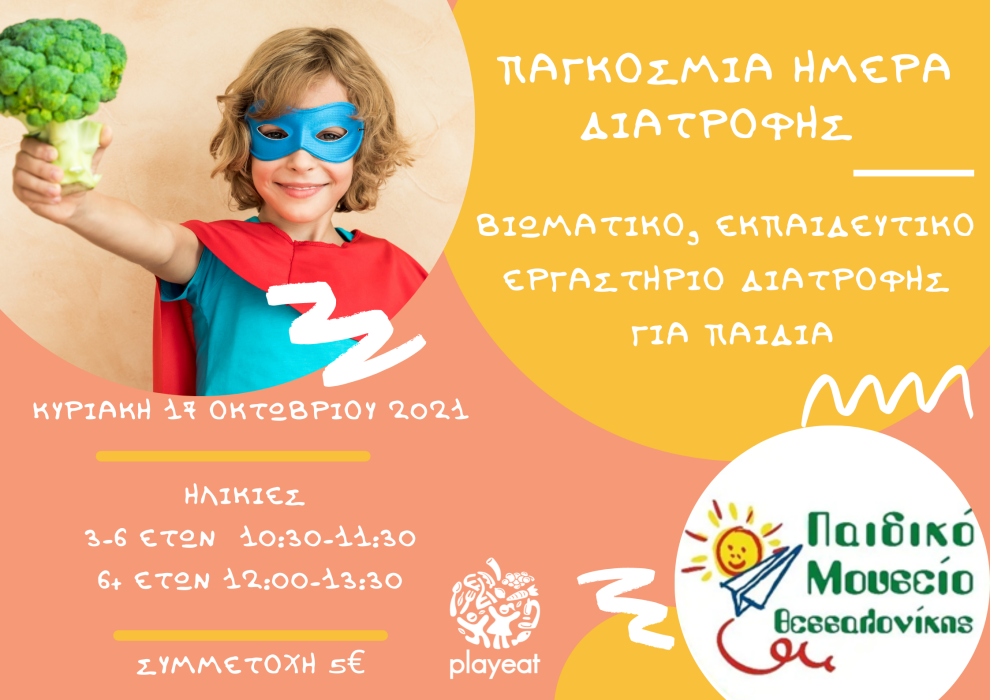 Γιορτάζουμε την Παγκόσμια Ημέρα Διατροφής! Φιλοξενούμε την ομάδα PlayEat που πραγματοποιεί τα βιωματικά εκπαιδευτικά εργαστήρια για παιδιά, που προάγουν την σωστή διατροφή μέσα από το παιχνίδι και την μουσική. Ζωγραφική με φρούτα και λαχανικά, παιχνίδι των αισθήσεων, παραμύθι και μουσικοκινητική, όλα αυτά στο μουσείο. Η επαγγελματική ομάδα της PlayEat έχει δημιουργήσει ένα υπέροχο παιχνίδι για μικρούς και μεγάλους.