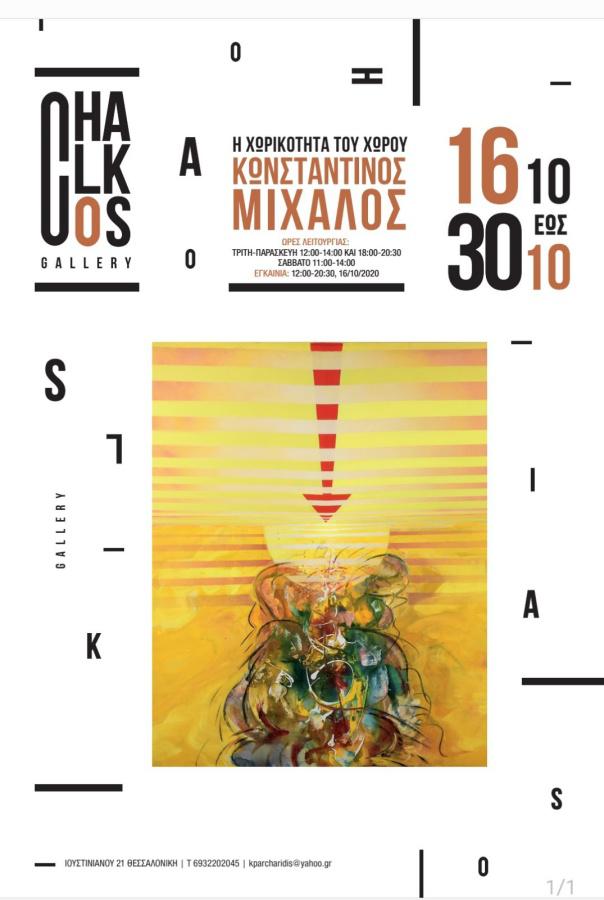Το Σάββατο 16 Οκτωβρίου από τις 12:00 ως τις 20:30 θα πραγματοποιηθούν τα εγκαίνια της έκθεσης ζωγραφικής με τίτλο «Χωρικότητα του Χώρου» του ζωγράφου Κωνσταντίνου Μίχαλου. Η έκθεση θα λάβει χώρα στην Chalkos Gallery από τις 16 Οκτωβρίου 2021 μέχρι τις 30 Οκτωβρίου 2021. Θα τηρηθούν αυστηρά όλα τα προβλεπόμενα για τον Covid-19 μέτρα.