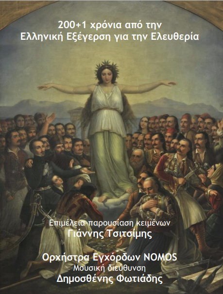 Η εκδήλωση αποτελεί μια πρόταση μνήμης και αναστοχασμού με αφορμή την συμπλήρωση δύο αιώνων από την ελληνική εξέγερση για την κατάκτηση της ελευθερίας. Η Ορχήστρα Εγχόρδων NOMOS (12 μουσικοί της Κρατικής Ορχήστρας Θεσσαλονίκης) υπό την διεύθυνση του μαέστρου Δημοσθένη Φωτιάδη, παρουσιάζει ένα μουσικό πρόγραμμα με έργα Ελλήνων συνθετών που έχουν ως βασική επιρροή τους την Ελληνική μουσική παράδοση. Ανάμεσα στα μουσικά κομμάτια, ο λογοτέχνης Γιάννης Τσιτσίμης διαβάζει αποσπάσματα από ποιητές και συγγραφείς της εποχής του 1821 ή νεότερους που έγραψαν για το όραμα του μεγάλου αγώνα.
