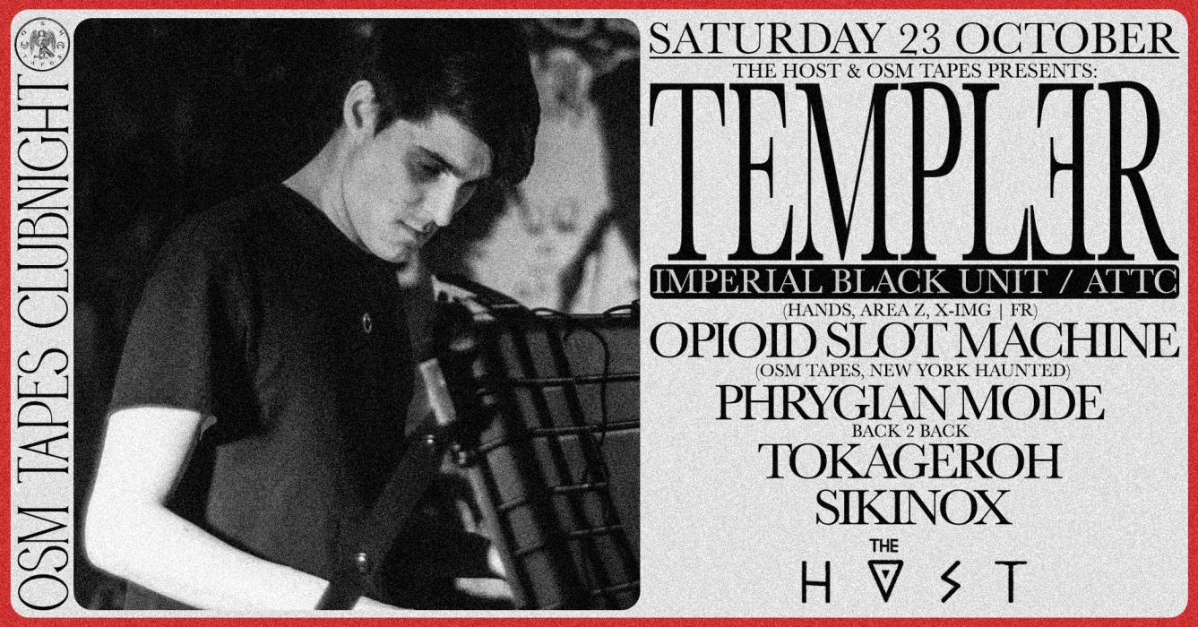 Σάββατο 23 Οκτωβρίου η OSM tapes σε συνεργασία με το The Host φιλοξενούν για πρώτη φορά στην Θεσσαλονίκη τον Templər. Μαζί του οι Opioid Slot Machine, Phrygian Mode, Tokageroh και Sikinox. Templər(Imperial Black Unit, HANDS, Area Z, X-IMG | FR) Templər είναι το solo project του Thomas Chalandon, μέλος των Imperial Black Unit με τον Pablo Bozzi. Ο Thomas από το 2016 όπου και εγκαταστάθηκε στο Βερολίνο βρίσκεται πίσω από διάφορα μουσικά project αλλά και από την δισκογραφική εταιρία Area Z. Σαν Imperial Black Unit κατόρθωσε σε ελάχιστο χρονικό διάστημα να καθιερωθεί στην παγκόσμια underground σκηνή και ο παλιομοδίτικος EBM ήχος του να φιλοξενηθεί στα σημαντικότερα event της Ευρώπης και όχι μόνο. Ως Templər κυκλοφόρησε πριν από λίγους μήνες το πρώτο του album στην θρυλική HANDS. Rhythmic noise και σκληρό industrial συνδυάζονται με EBM και techno μπασογραμμές παράγοντας όπως λέει και ο ίδιος μία “άβολη” μουσική. Ο Templər θέλει να μεταφέρει ένα πολιτικό μήνυμα το οποίο καταδικάζει τα ανθρώπινα λάθη. Ο ενοχλητικός ήχος του δημιουργήθηκε για να αντικατοπτρίζει την κακή πλευρά του ανθρώπου.