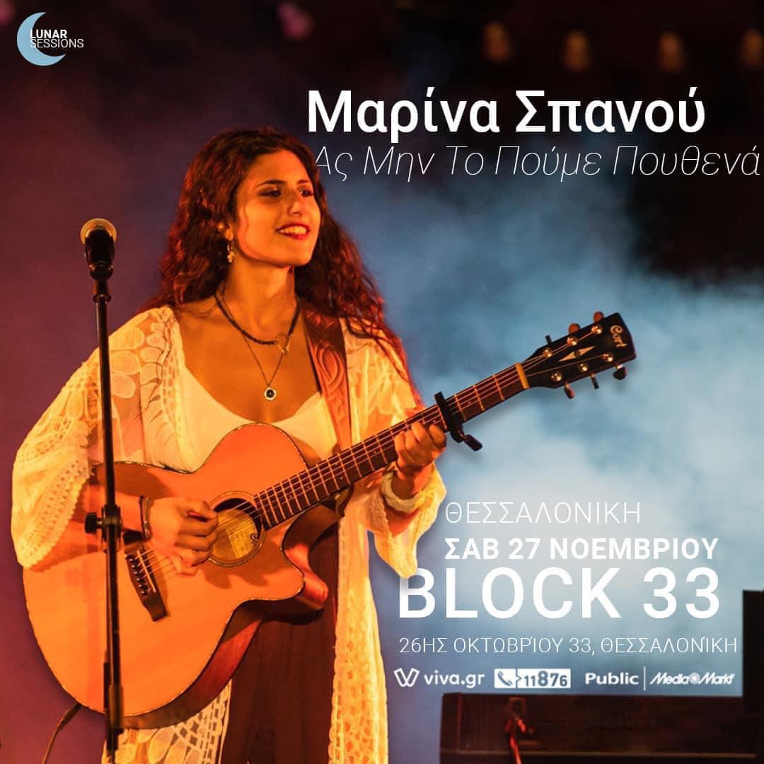 Μαρίνα Σπανού «Ας Μην Το Πούμε Πουθενά» στο Block33 στη Θεσσαλονίκη, το Σάββατο 27 Νοεμβρίου 2021. Η Μαρίνα Σπανού ξεκινά τις χειμερινές της εμφανίσεις από τη Θεσσαλονίκη, στο Block33 στις 27 Νοεμβρίου, και την Πάτρα, στο Lunar Space στις 4 Δεκεμβρίου. Ας μην το πούμε πουθενά πως τα Σάββατα αυτά αγαπιόμαστε πάλι. Με κάτι λιγότερο από κρύες μπύρες και κάτι περισσότερο από πλεκτά μπλουζάκια, θα χωράμε ακόμα όσα μπορούμε να τραγουδήσουμε. Ίσως είναι πιο ζεστά τα Σάββατα αυτά, αλλά ας μην το πούμε πουθενά.