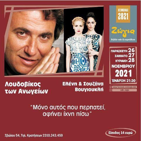 Οι LIVE βραδιές συνεχίζονται στον φιλόξενο χώρο της Ζώγια και παρουσιάζουν το πρώτο μεγάλο LIVE του φετινού χειμώνα. Τρεις βραδιές γεμάτες λυρισμό, ποίηση, νότες και ιστορίες… Ο Λουδοβίκος των Ανωγείων και οι αδελφές Ελένη & Σουζάνα Βουγιουκλή παρουσιάζουν την μουσική παράσταση: “Μόνο αυτός που περπατεί, αφήνει ίχνη πίσω”. Ο συγκινητικός Ανωγειανός τροβαδούρος του πόνου και του έρωτα, και «οι ιέρειες της πολυπολιτισμικότητας» όπως έχουν χαρακτηρισθεί οι αδελφές Βουγιουκλή, συμπράττουν σε τρία μοναδικά LIVE στη Ζώγια (26,27 & 28/11).