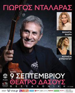 Μετά τις sold out καλοκαιρινές συναυλίες, ο Γιώργος Νταλάρας θα βρεθεί τη Πέμπτη 9 Σεπτεμβρίου στο θέατρο Δάσους στη Θεσσαλονίκη. Μαζί του θα είναι οι ταλαντούχες Βιολέτα Ίκαρη και Ασπασία Στρατηγού. Θα παρουσιάσει ένα μοναδικό πρόγραμμα με τραγούδια σταθμούς από την πλούσια δισκογραφία του και τη συνεργασία του με τους μεγάλους Έλληνες συνθέτες αλλά και καινούργιο υλικό.