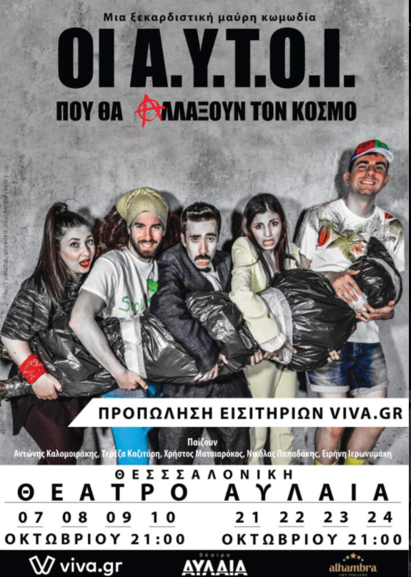 «Οι Α.Υ.Τ.Ο.Ι. που θα αλλάξουν τον κόσμο» είναι μια νέα κωμωδία του Αντώνη Καλομοιράκη που θα παρουσιάζεται κάθε Τετάρτη το φετινό χειμώνα 2021 στο ALHAMBRA ART THEATRE. Η παράσταση ξεκινάει δυναμικά από τη Θεσσαλονίκη στο θέατρο ΑΥΛΑΙΑ για 8 παραστάσεις στις 7-8-9-10 & 21-22-23-24 Οκτωβρίου. Πέντε νέοι ηθοποιοί ενώνουν το πάζλ μιας ξεκαρδιστικής κωμωδίας, που θα μείνει σε όλους αξέχαστη.
