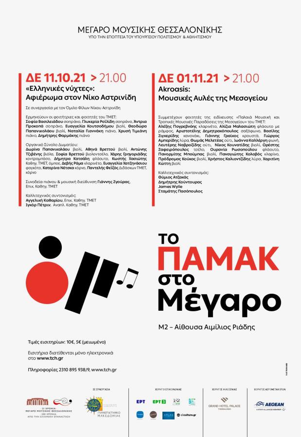 *Δευτέρα 11 Οκτωβρίου 2021, ώρα 21.00, αίθουσα Αιμίλιος Ριάδης, κτήριο Μ2. Τιμές εισιτηρίων 10€, 5€ (μειωμένο). Τα εισιτήρια διατίθενται μόνο ηλεκτρονικά ΕΔΩ. Η συναυλία είναι Covid Free.
