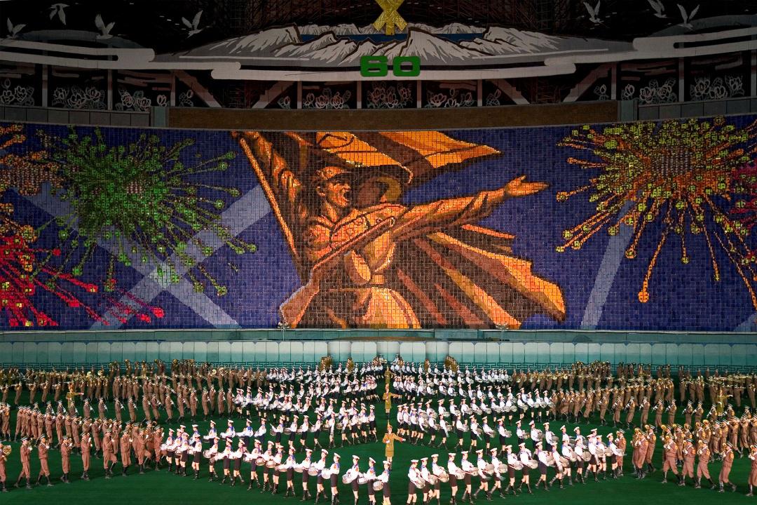 Το Arirang είναι ένα λαϊκό κορεατικό τραγούδι, μια ιστορία αγάπης με χιλιάδες παραλλαγές, που θεωρείται ύμνος της χώρας και εκτιμάται ότι μετράει 600 χρόνια ζωής. Αναγορεύτηκε μνημείο άυλης κληρονομιάς της UNESCO. Η έκθεση αποτυπώνει τους Μαζικούς Αγώνες οι οποίοι ενορχηστρώνουν το πολιτικό αφήγημα της Βόρειας Κορέας, με έμφαση στο Εργατικό Κόμμα και τις ένοπλες δυνάμεις, με συμβολισμούς συχνά δυσδιάκριτους στο δυτικό βλέμμα.