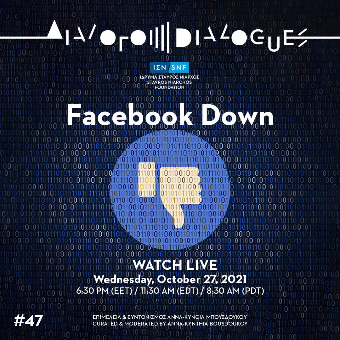 *Την Τετάρτη 27 Οκτωβρίου 2021 στις 18:30, διαδικτυακά στο snfdialogues.org. Συμπλήρωσε τη φόρμα συμμετοχής για να συνδεθείς ζωντανά, με εικόνα και ήχο, και να θέσεις απευθείας τα ερωτήματα και τους προβληματισμούς στους ομιλητές της συζήτησης, Η συζήτηση θα πραγματοποιηθεί στα αγγλικά με παράλληλη διερμηνεία στα ελληνικά. Για να παρακολουθήσετε το επόμενο webcast των Διαλόγων με τίτλο “Facebook Down” πραγματοποιήστε online εγγραφή ΕΔΩ. Στείλτε μας τις ερωτήσεις σας ΕΔΩ.