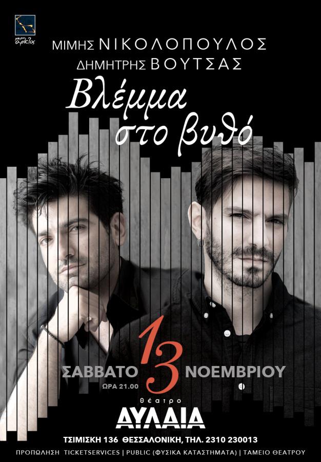 Έτσι το Σάββατο 13 Νοεμβρίου, στο Θέατρο Αυλαία στις 21:00, ο Δημήτρης Βουτσάς και ο Μίμης Νικολόπουλος με πενταμελή ορχήστρα γιορτάζουν την πρεμιέρα των τραγουδιών με τίτλο «Βλέμμα στο βυθό», σε μια μουσική παράσταση η οποία περιλαμβάνει επίσης μια γεύση από τις ορχηστρικές δουλειές του συνθέτη αλλά και επιλεγμένα εμβληματικά τραγούδια. Δίπλα τους θα βρίσκονται για να μιλήσουν για το νέο κύκλο τραγουδιών η στιχουργός Φωτεινή Λαμπρίδη αλλά και ο παραγωγός του δίσκου Παρασκευάς Καρασούλος.